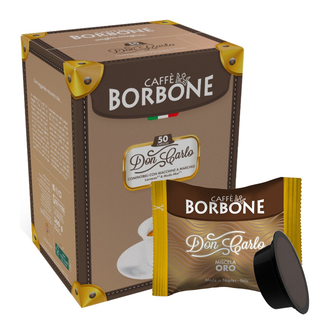 Capsule compatibili con sistema Lavazza® A Modo Mio® Caffè Borbone Don Carlo Miscela Oro, ricca e cremosa come quella del bar. Confezione da 50 capsule.