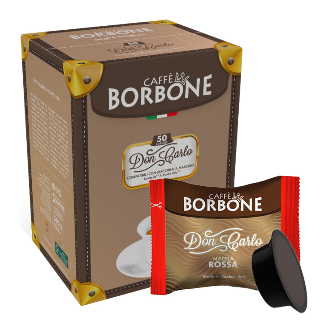 Capsule compatibili con sistema Lavazza® A Modo Mio® Caffè Borbone Don Carlo Miscela Rossa, ricca e cremosa come quella del bar. Confezione da 50 capsule.