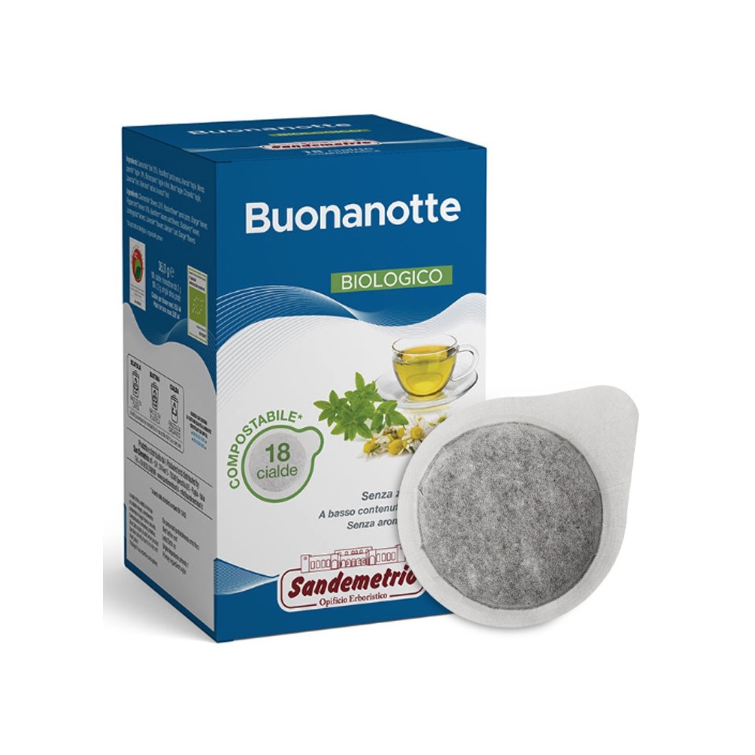 Tisana rilassante Bio Buonanotte Sandemetrio in cialde compostabili ESE 44 mm, confezione da 18 pezzi. Un aromatico infuso di erbe e frutti senza zucchero, per regalarsi un momento di relax e un sonno rigenerante.