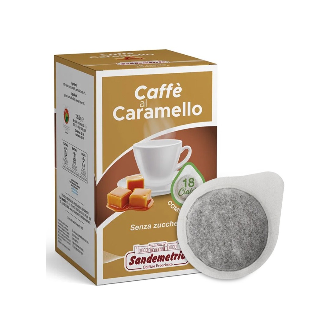 Cialde di Caffè al Caramello Sandemetrio per macchine con sistema ESE 44 mm in confezione da 18 cialde compostabili monodose. Una deliziosa fusione di intensità e dolcezza, nata dall'incontro dell'espresso intenso con l'avvolgente piacevolezza del caramello.