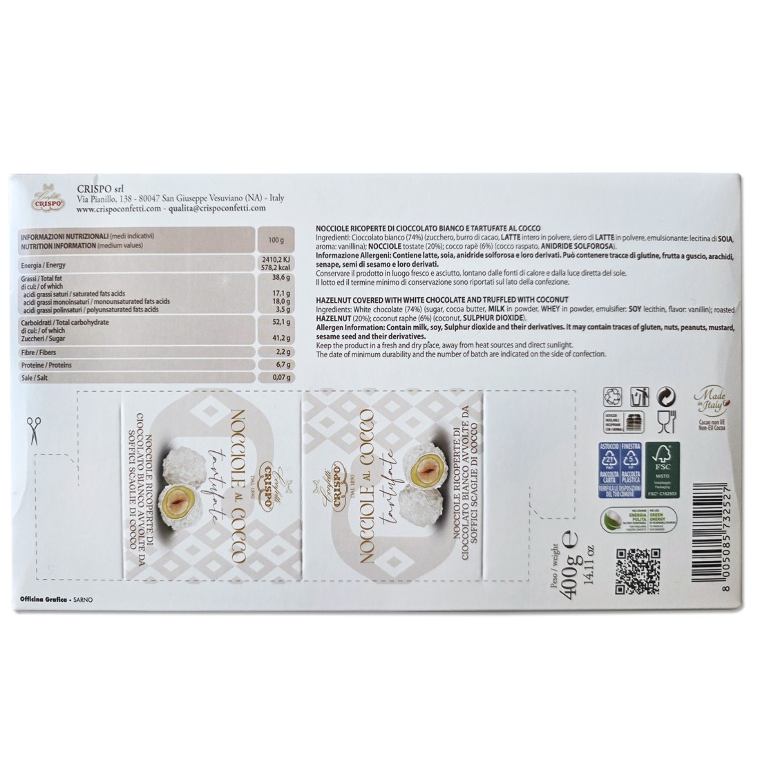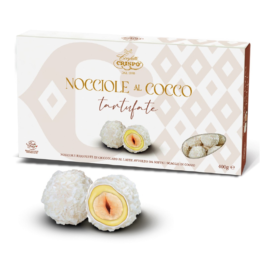 Prova le nocciole tartufate al cocco Crispo, dove la dolcezza del cioccolato bianco si fonde con la delicatezza del cocco.