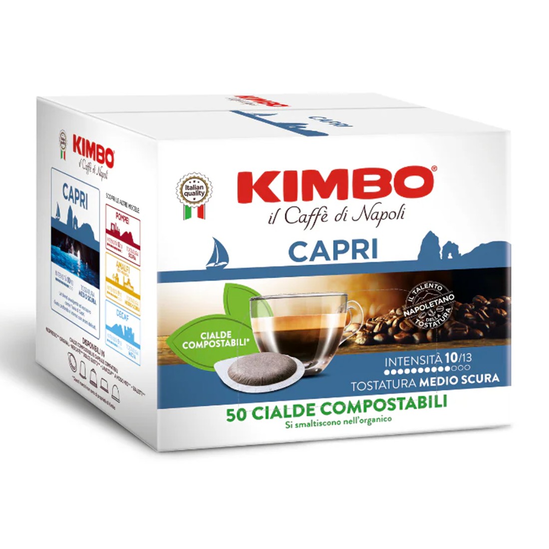 Vivi l'esperienza del vero espresso italiano, con le cialde Kimbo in filtro carta ESE 44 mm miscela Capri.