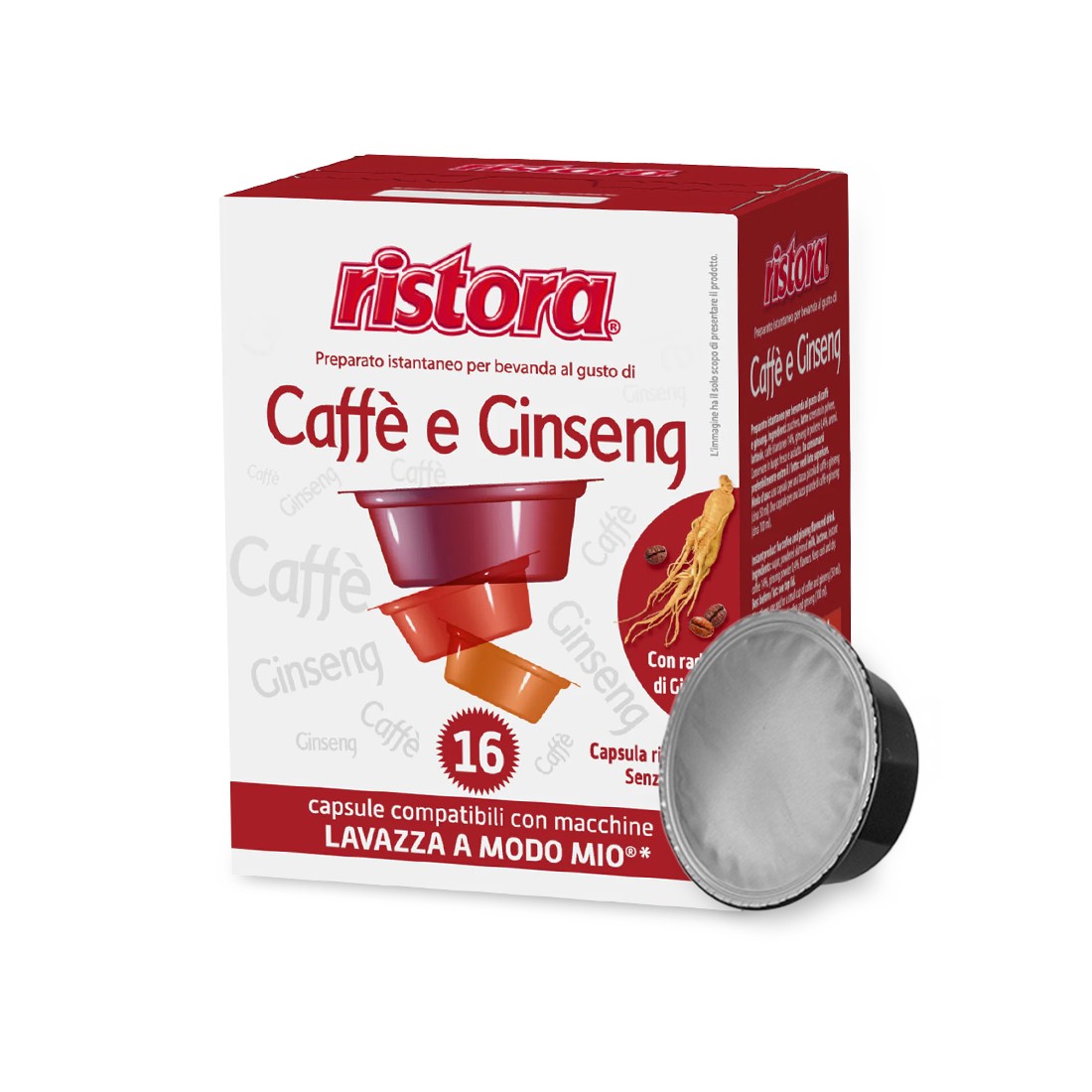 16 Capsule di caffè al ginseng Ristora compatibili con A Modo Mio, tutto l'aroma del caffè con la carica energizzante del ginseng, per iniziare la giornata con la carica di energia che ti serve.