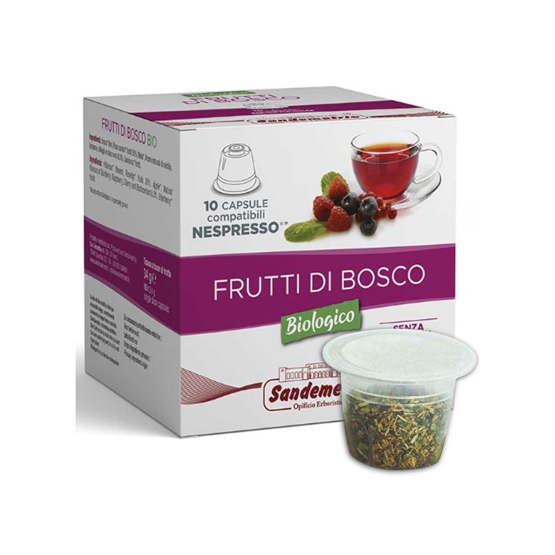 Infuso Bio di Frutti di Bosco Sandemetrio in capsule compatibili con macchine Nespresso, confezione da 10 capsule. Un infuso aromatico senza zucchero, arricchito dalle note dolci e aspre dei frutti di bosco.