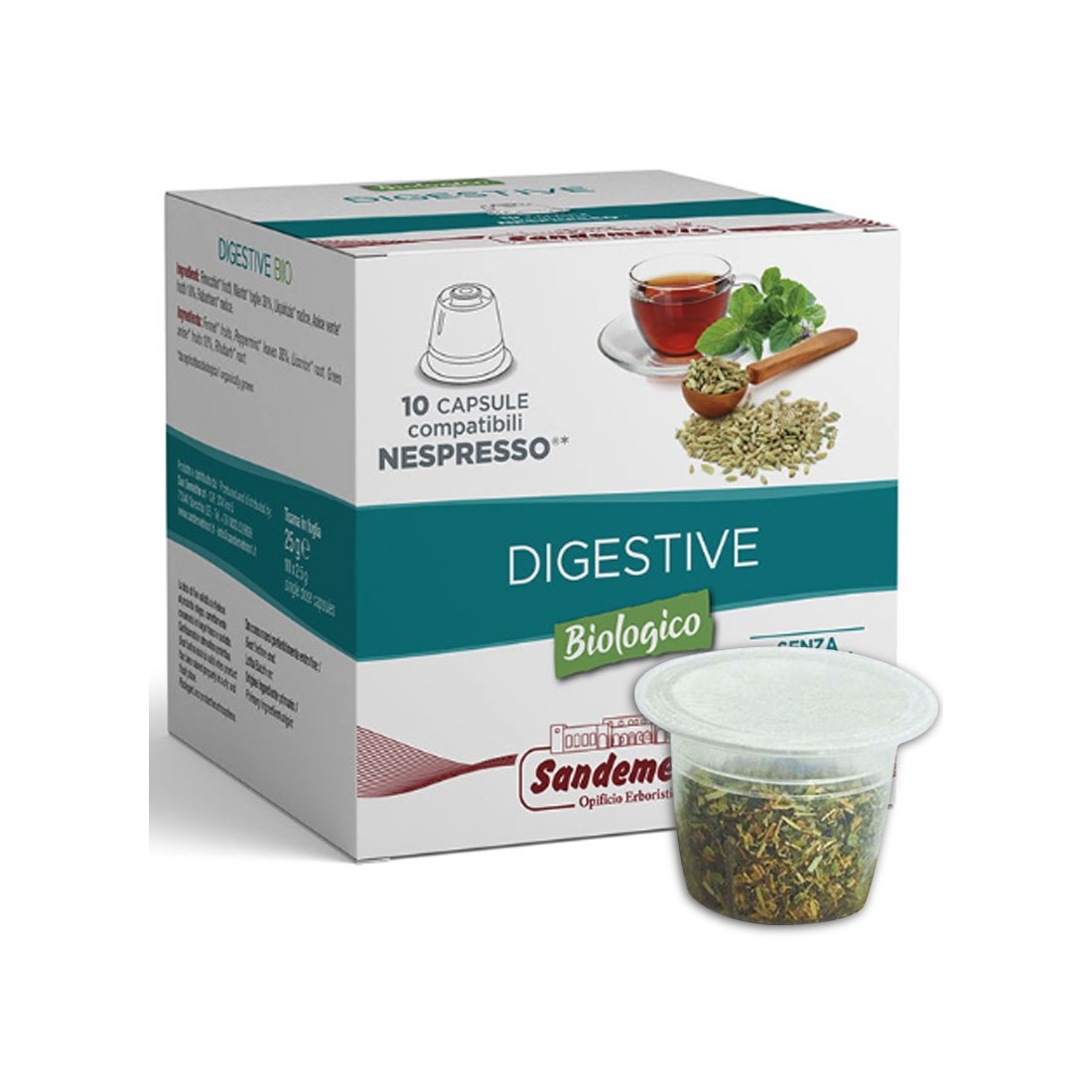 Tisana digestiva Bio Sandemetrio in capsule compatibili con macchine Nespresso®, confezione da 10 capsule. L'infuso Digestive è una combinazione unica di erbe aromatiche dalle preziose proprietà calmanti che favoriscono la digestione.