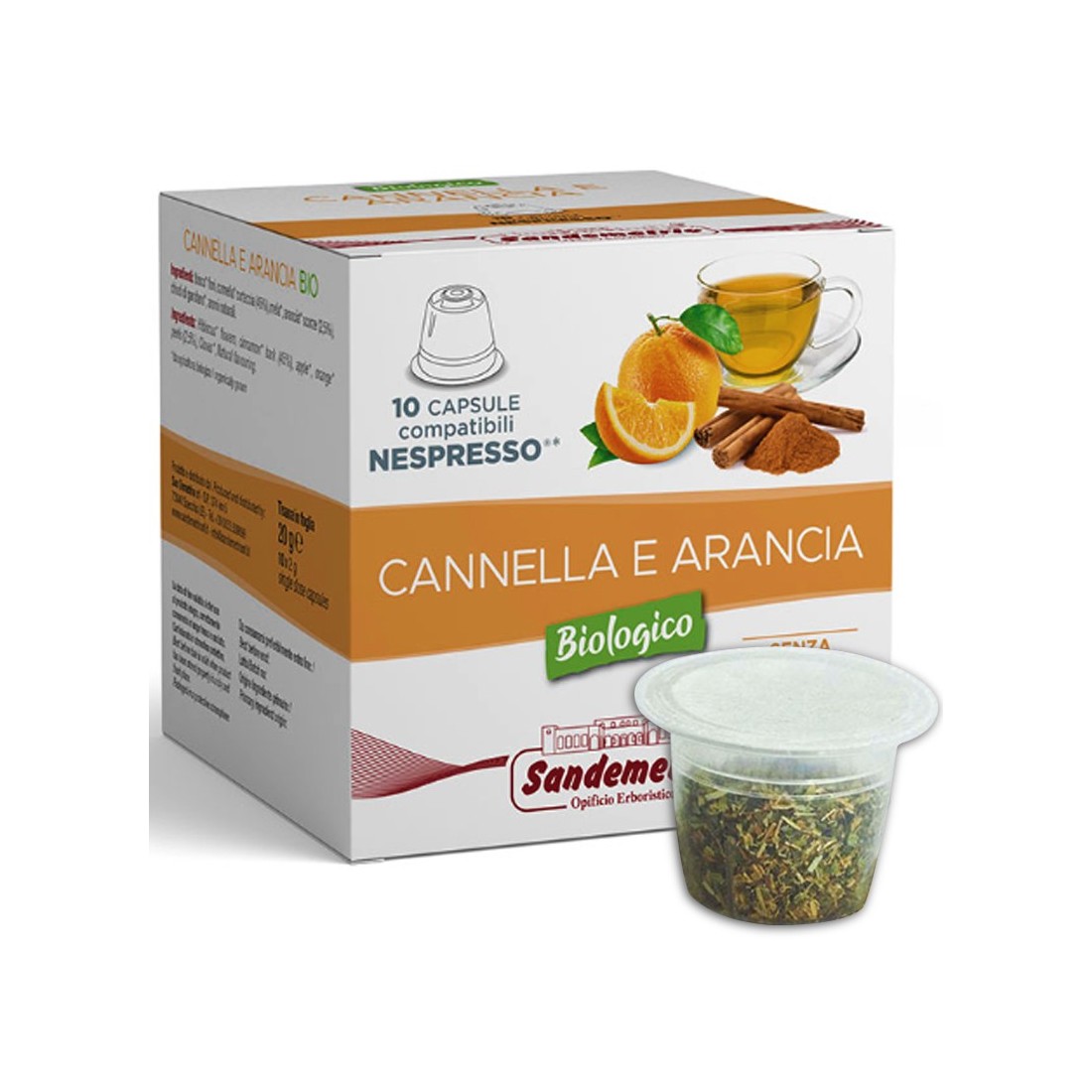 Infuso Bio Cannella e Arancia Sandemetrio in capsule compatibili con macchine Nespresso, confezione da 10 capsule. Un infuso aromatico senza zucchero, arricchito dal profumo dell'arancio e dal retrogusto speziato di cannella.