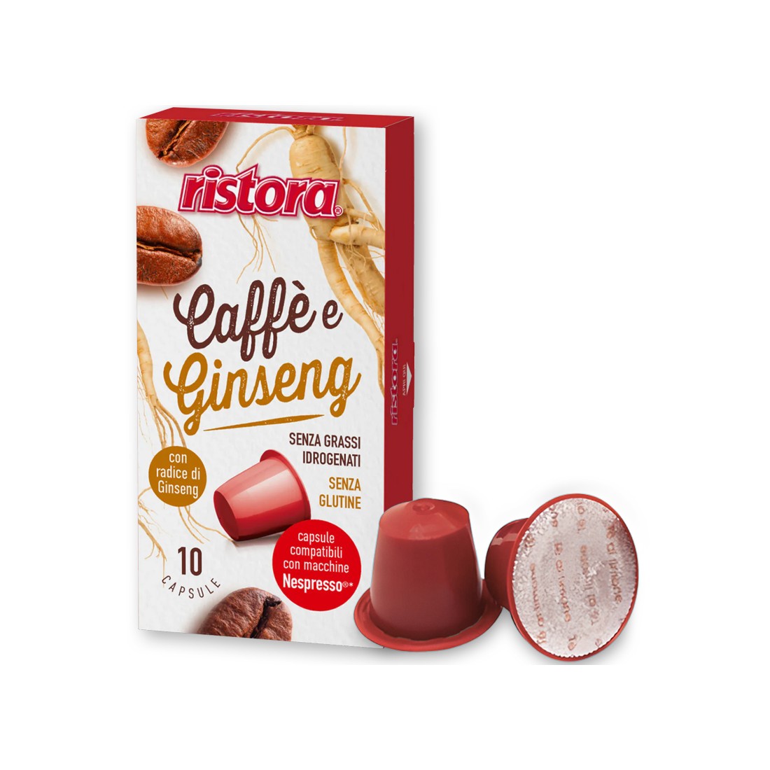 10 Capsule di caffè al ginseng Ristora compatibili con Nespresso, tutto l'aroma del caffè con la carica energizzante del ginseng, per iniziare la giornata con il piede giusto.