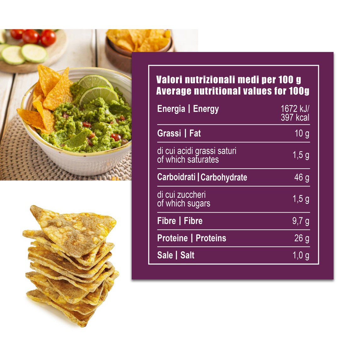 Chips leggere e croccanti, ricche di proteine vegetali, senza glutine, ideali per uno spuntino sfizioso e nutriente, perfetto a casa o on-the-go.